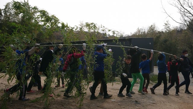 頑張ってノコギリで切った大きな竹が倒れていくのを見て子どもたちは大興奮!!