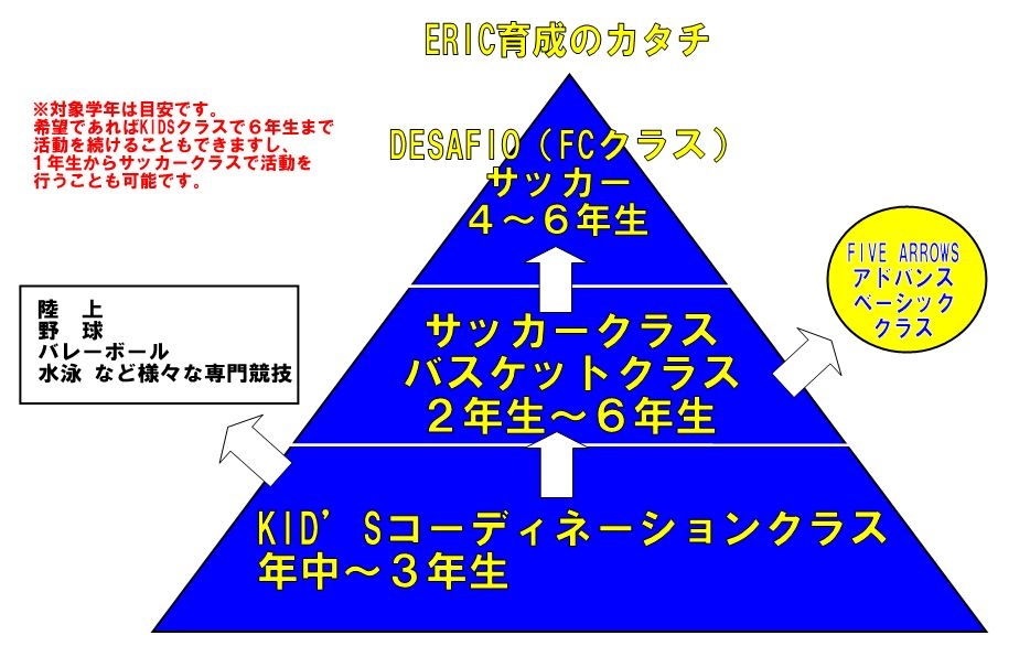ERICでは子どもたちの発育・発達や成長を考慮し、 それぞれの子ども達の適正や意向を鑑み、 サッカー・バスケットスクールや様々な競技に ステップアップを図ることができます。